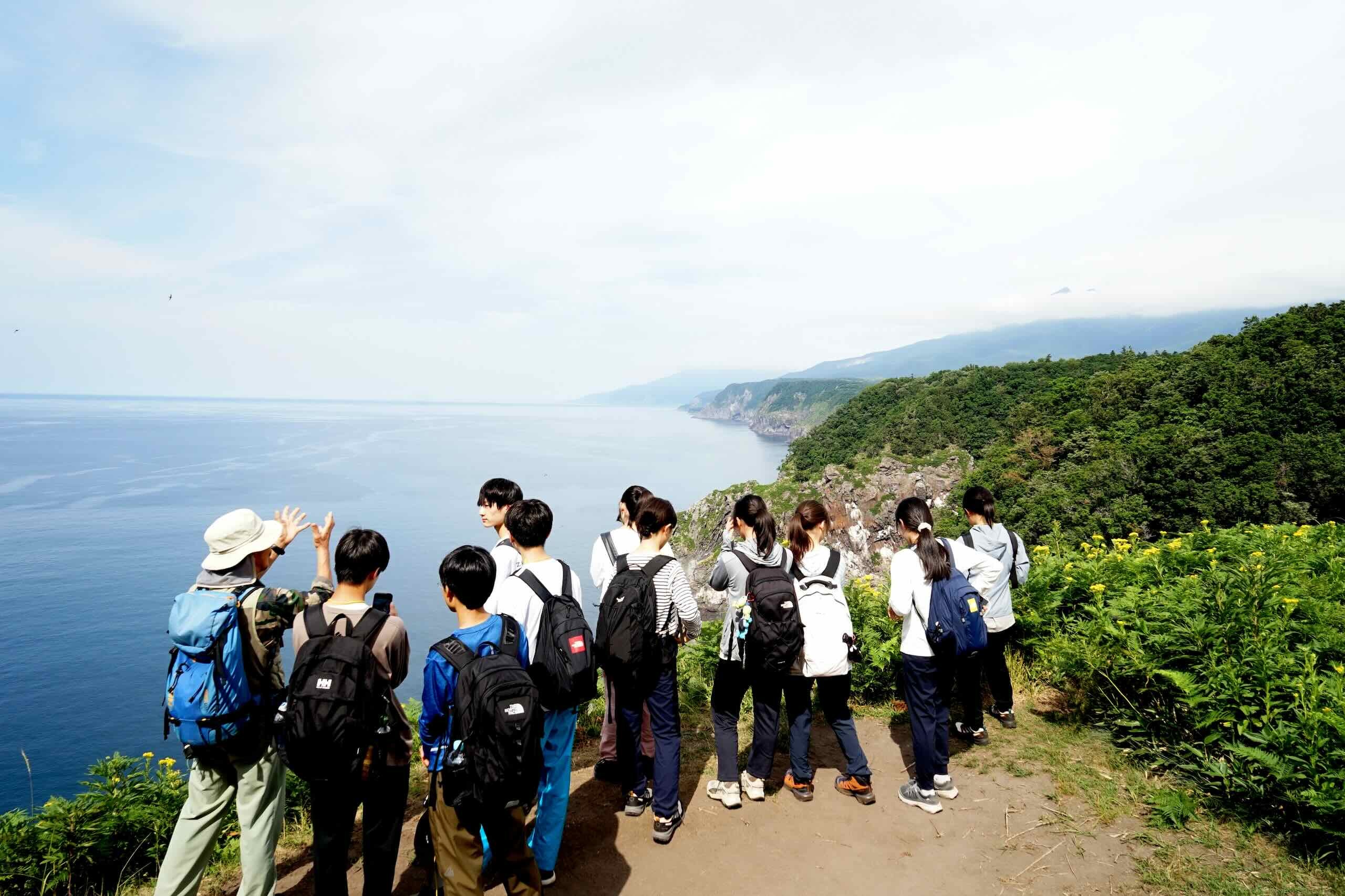 道中では、午前中の講義で学んだ、シラカンバ、トドマツ、チシマザサといった化粧品の原料となる植物も実際に手に取り観察できた。高台から知床半島を眺めることもでき、生徒たちは北海道の大自然を体感する機会となった。