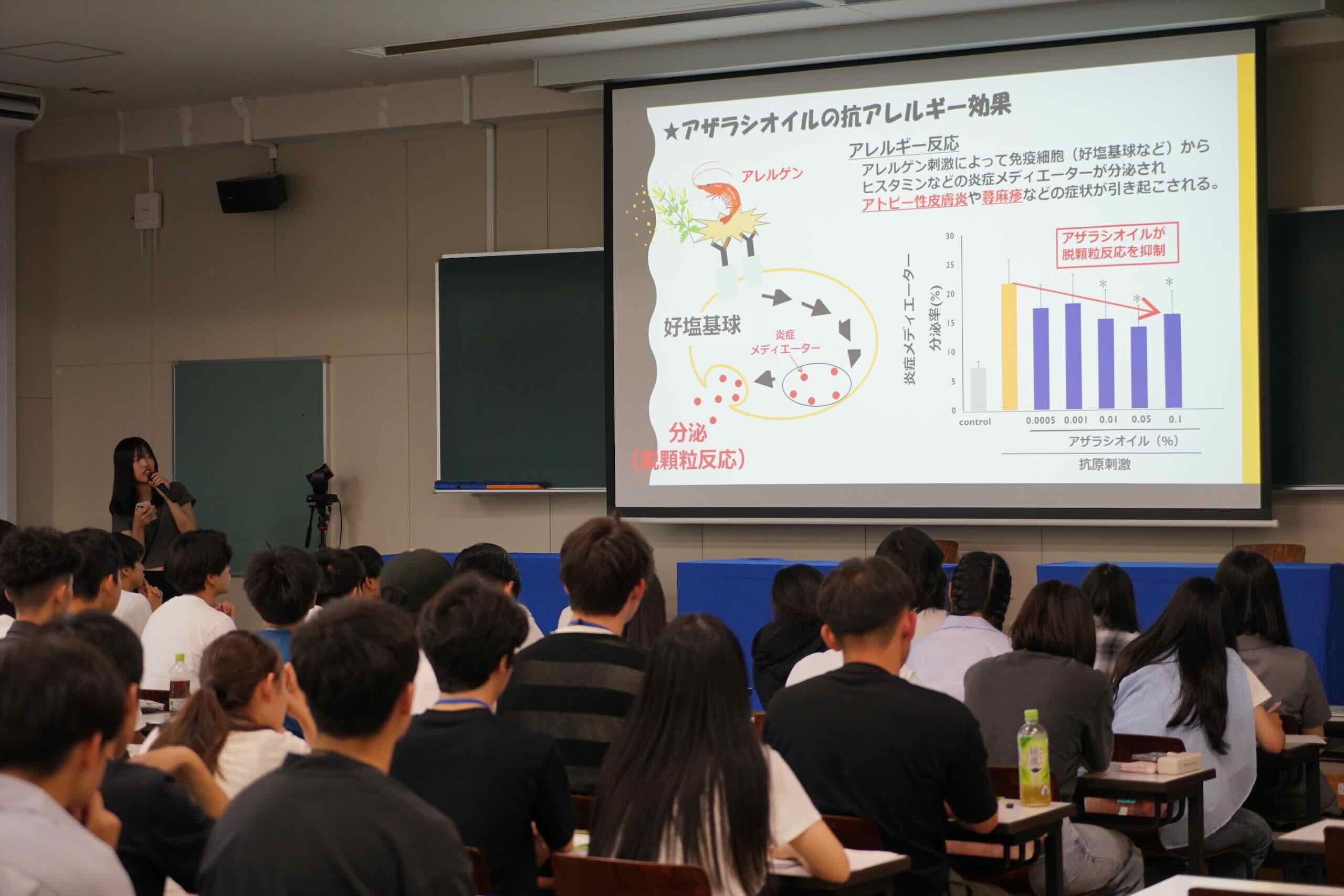 食香粧化学科の学生はアザラシオイルを対象とした化粧品への活用法の研究、北方圏農学科の学生は知床の原生林を観察する研究、海洋水産学科の学生はアザラシの生態調査、自然資源経営学科は近隣で獲れるモクズガニを使ったインスタントラーメンの商品開発をテーマに発表を行った。