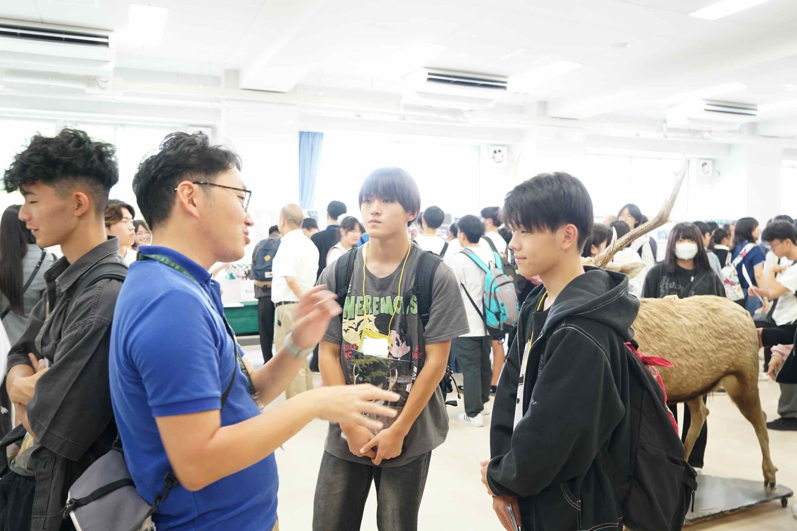 その後、生物産業学部の教員や学生と参加した生徒たちの交流タイムへ。ヒグマやエゾシカの剥製、さらに各学科の研究ポスターが並ぶ教室で、発表に関する質問や議論が活発に行われた。