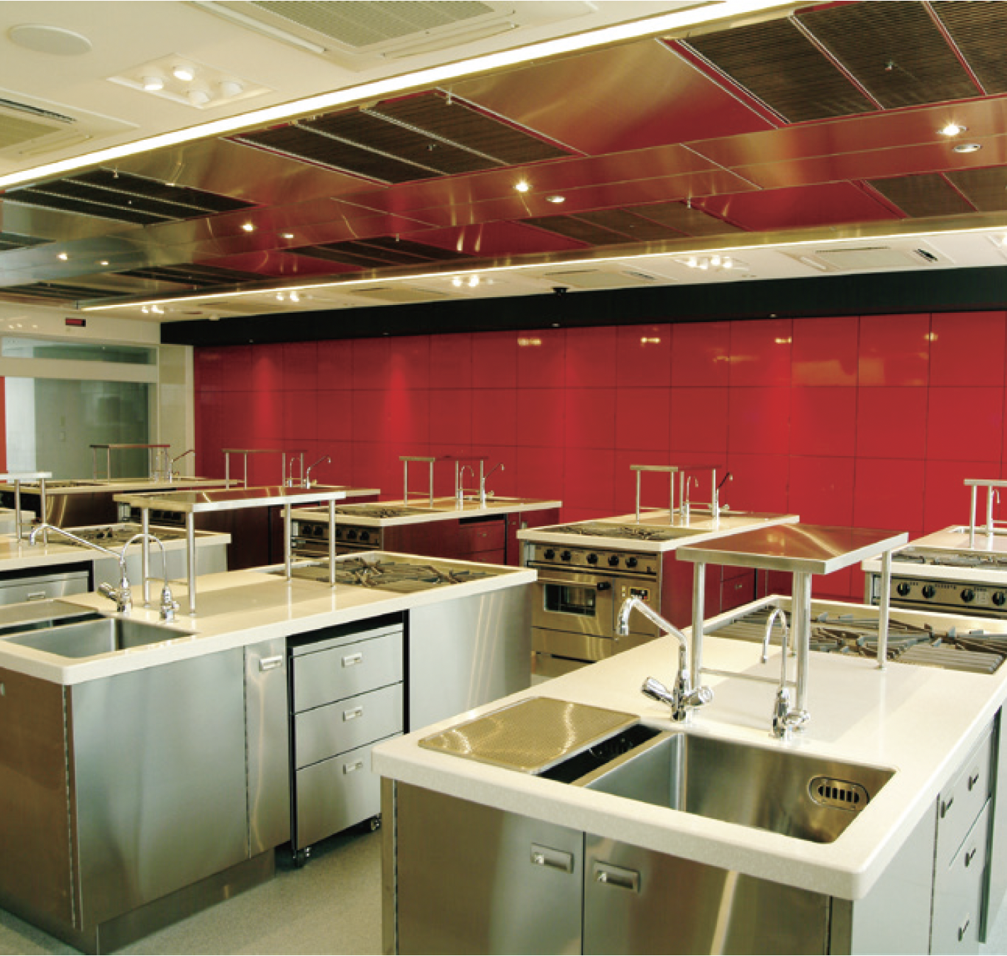 ここでは、西洋料理、日本料理、中国料理の基礎から最新技術までを学べるほか、製菓製パンの技術、さらにワインや接客サービス・店舗経営など、プロの料理人に必要な知識を総合的に習得することができる。