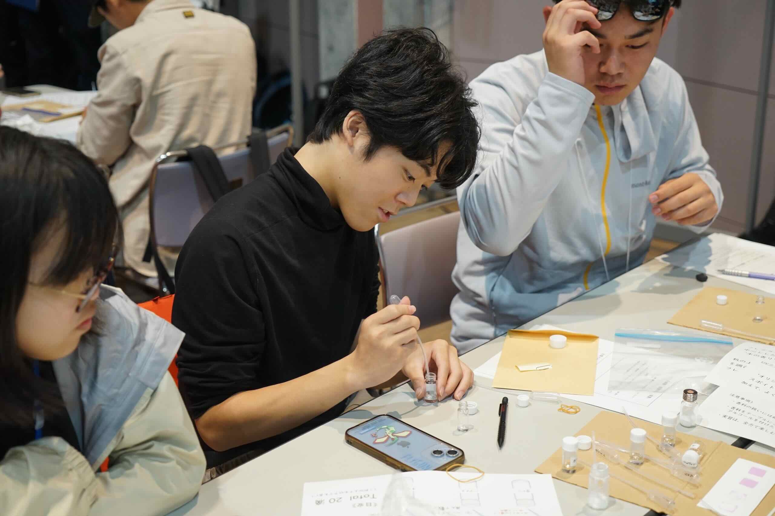 続いて、実験は「調香」の工程へ。各グループのテーブル上に並ぶ香料をベースに、オリジナルフレグランスの調合に挑戦した。