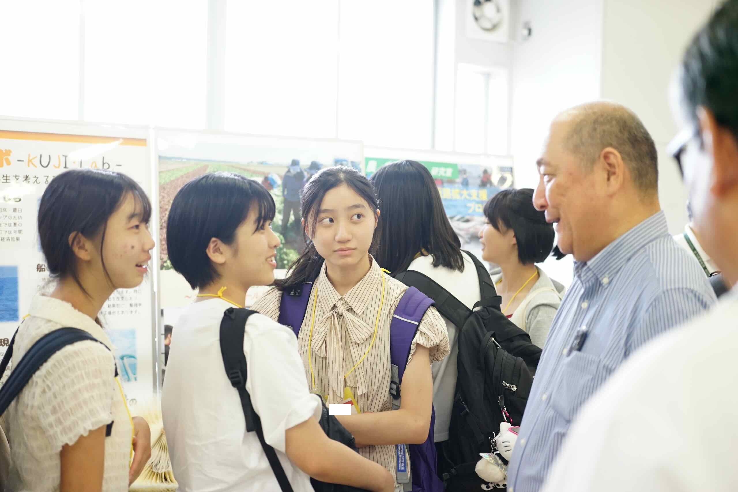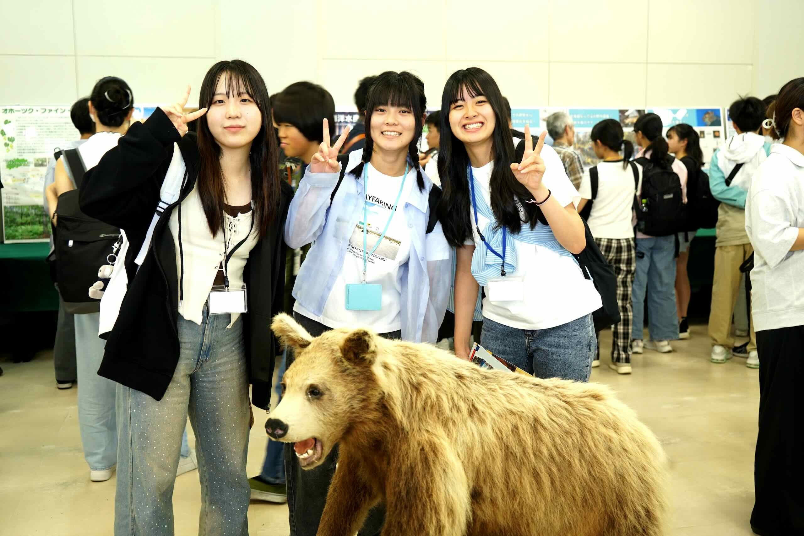 その後、生物産業学部の教員や学生と参加した生徒たちの交流タイムへ。ヒグマやエゾシカの剥製、さらに各学科の研究ポスターが並ぶ教室で、発表に関する質問や議論が活発に行われた。