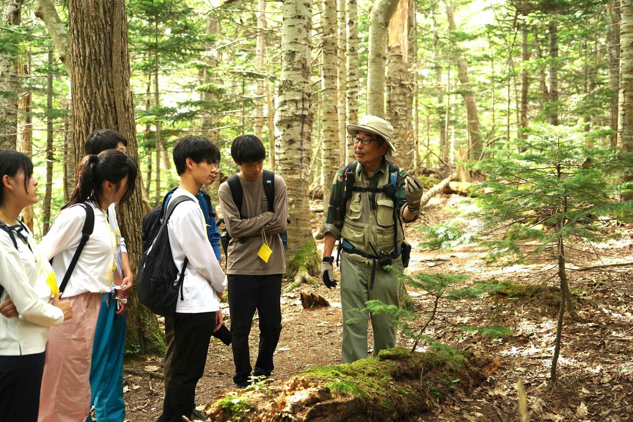 道中では、午前中の講義で学んだ、シラカンバ、トドマツ、チシマザサといった化粧品の原料となる植物も実際に手に取り観察できた。高台から知床半島を眺めることもでき、生徒たちは北海道の大自然を体感する機会となった。